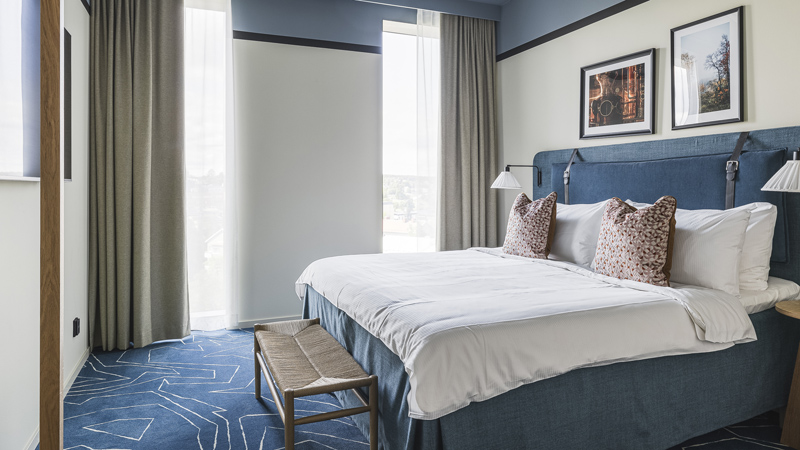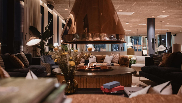De nio våningarna och 122 rummen är inredda med inspiration från Hernö Gins destilleri i Dala, en visuell förlängning av de intryck och upplevelser som möter besökare där. Färgskalan i textilier och väggar speglar destilleriets egna nyanser, men i en mjukare, mer avskalad ton. Kopparinslag i inredningen för tankarna till de handhamrade kopparpannorna som används i ginproduktionen, medan naturmaterial som trä och inslag av grönt förmedlar känslan av närheten till naturen.